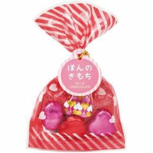 袋の一部が透明になっていて、赤・ピンクのかわいいハート型のチョコレートが見えるのがおしゃれ。袋に巻かれた丸い小さなカードには、「ほんのきもち」などの一言メッセージが書かれているので、自分の言葉で気持ちを伝えるのが苦手な方にもおすすめですね。